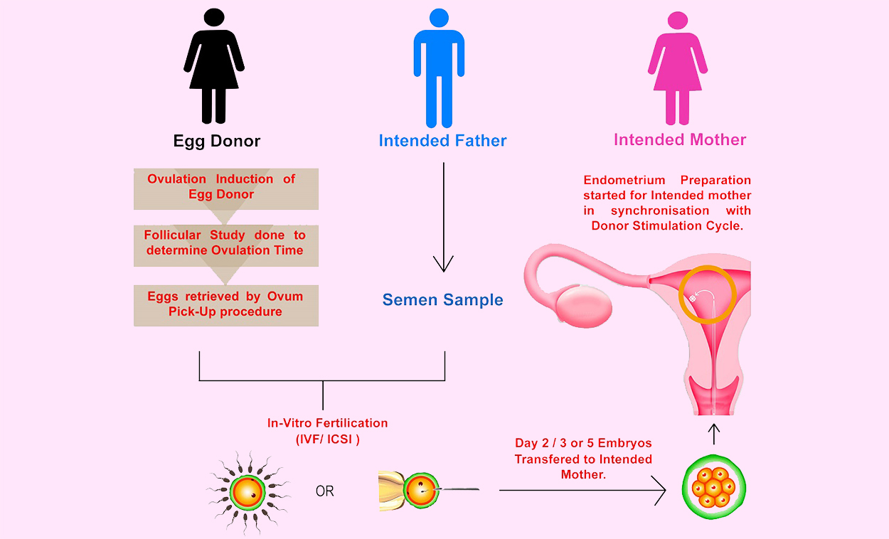 The fertility egg donation process involves retrieving eggs from a woman who has normally functioning ovaries. Following egg retrieval, the eggs are fertilized in the in vitro fertilization (IVF) lab using sperm from the receiving couple’s partner, or in certain situations with donor sperm. Following fertilization in the laboratory and growth of the embryos for either 3 or 5 days, the resulting embryos are transferred to the uterus of the woman who wishes to carry the baby. If a pregnancy is established, the receiving woman becomes the mother carrying the developing baby through the full term of the pregnancy and childbirth – with all the joys of experience that this affords.
